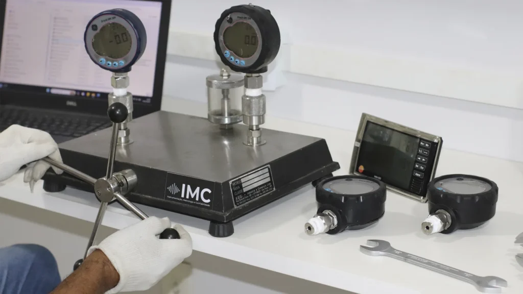 Ajuste e verificação de instrumentos de medição de pressão para assegurar exatidão e conformidade.